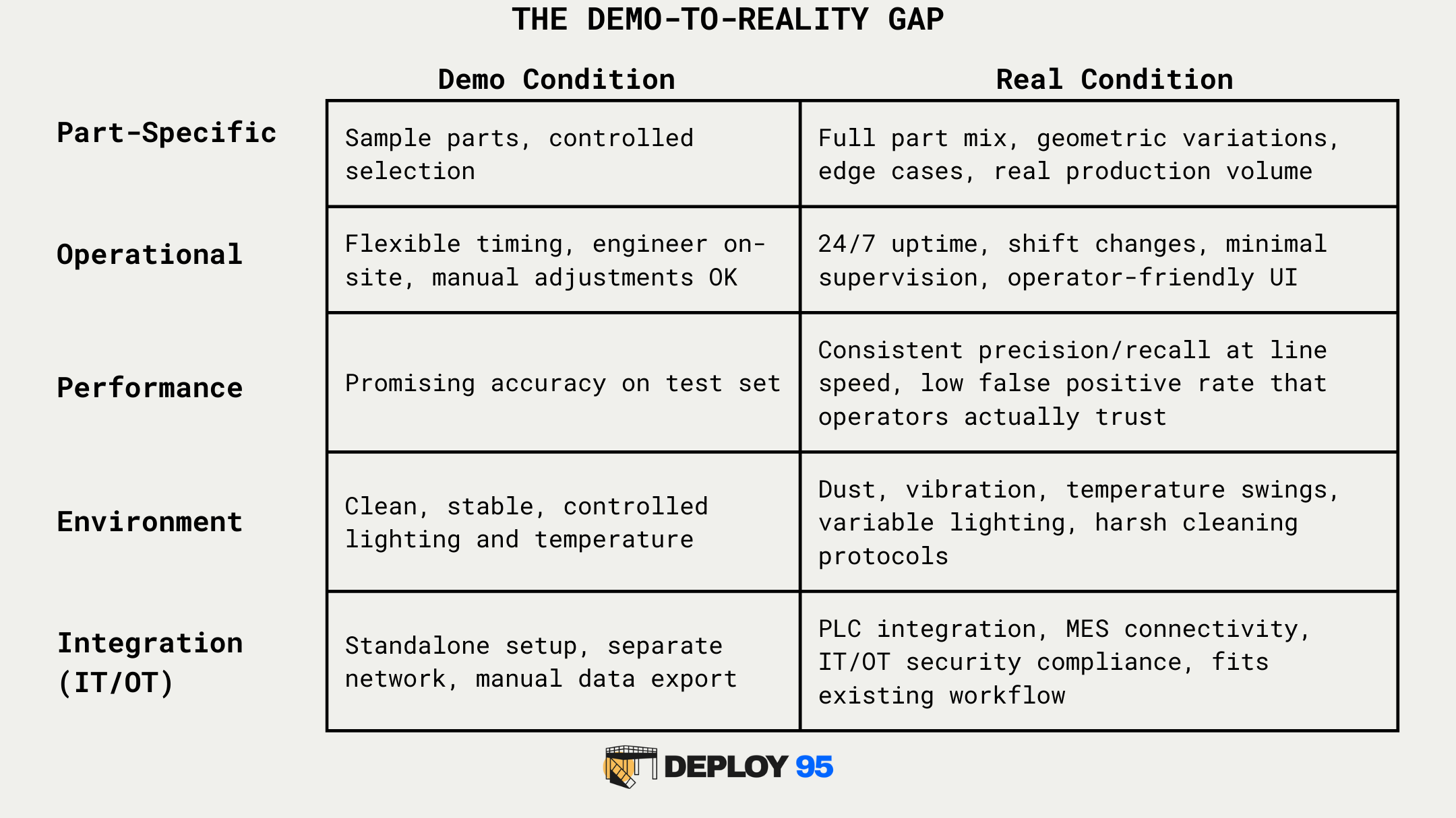 When sophisticated buyers watch a demo, they're mentally running it against their constraints. The slightly different part geometry. The lighting during second shift. The legacy fixture that doesn’t appear on any floor plan.