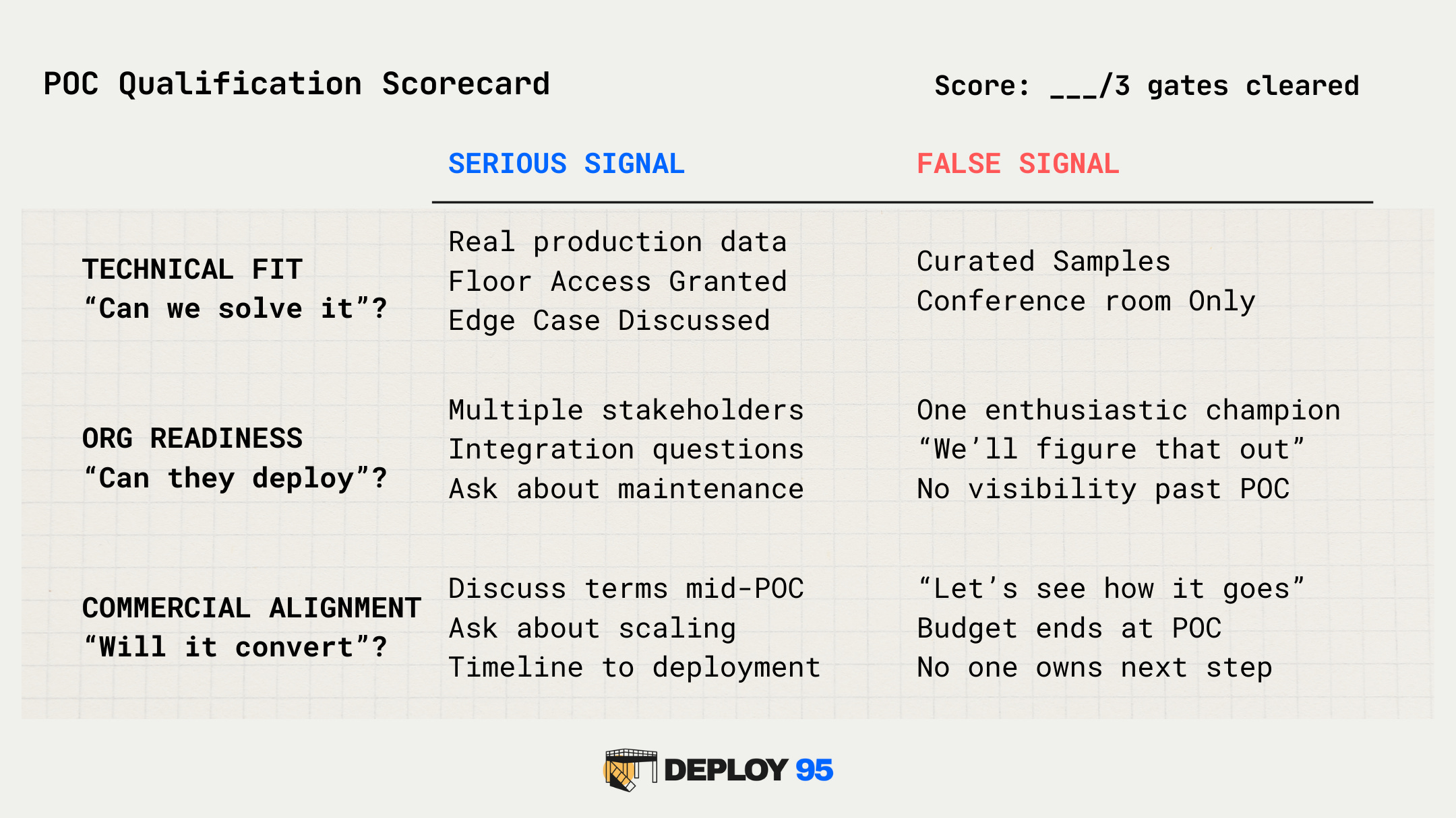 Not every inquiry is a real opportunity. Some buyers want to check a box. Others want to see what's out there. The POC Qualification Scorecard separates serious signal from noise.