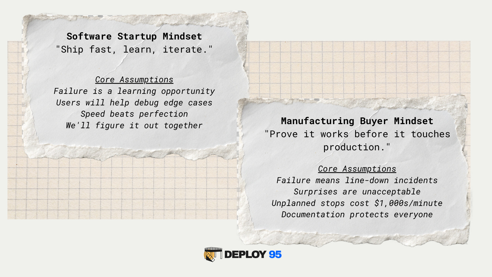 Enterprise buyers evaluate risk differently from what startups expect. Every stage (from POC, to pilot, to deployment) deepens the buyer's commitment and their risk exposure. The larger the manufacturer, the more costly each minute of downtime becomes.