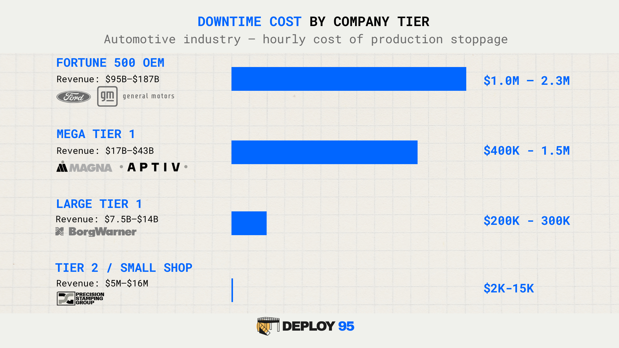 Here is what it looks like in practice: 10 minutes of downtime at GM costs $380,000. The same 10 minutes at a Tier 2 supplier? $2,500. Same failure, but a consequence 150 times smaller.