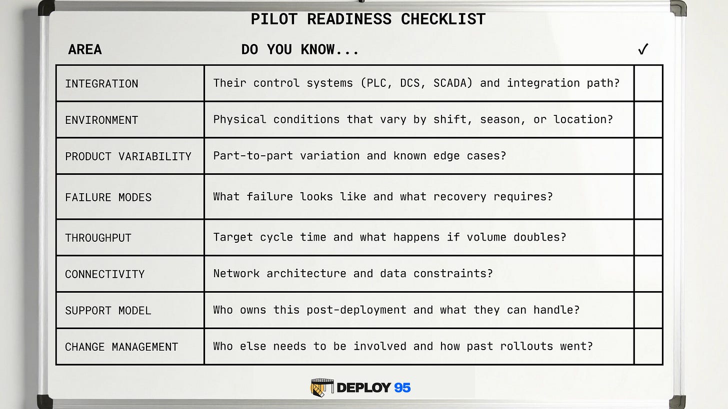 If you don’t know what pilot requires, you’ll learn on their floor. If you can’t support what you’re selling, deployment becomes their problem.