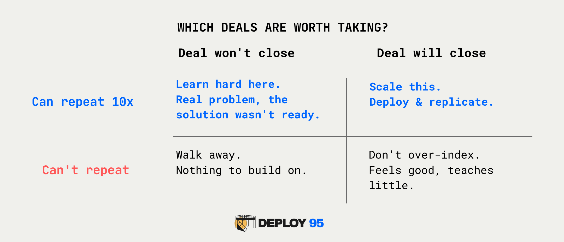 A deal can have strong buyer signal and still teach you nothing scalable. The matrix forces a harder question: even if we win, can we repeat this ten times?