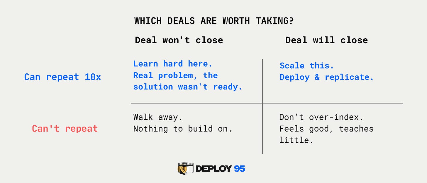 One more question: Does this deployment build toward something repeatable? Return to the matrix. A deployment with strong buyer signal but weak market signal might still be worth taking, but don’t let it consume resources that should go toward repeatable wins.